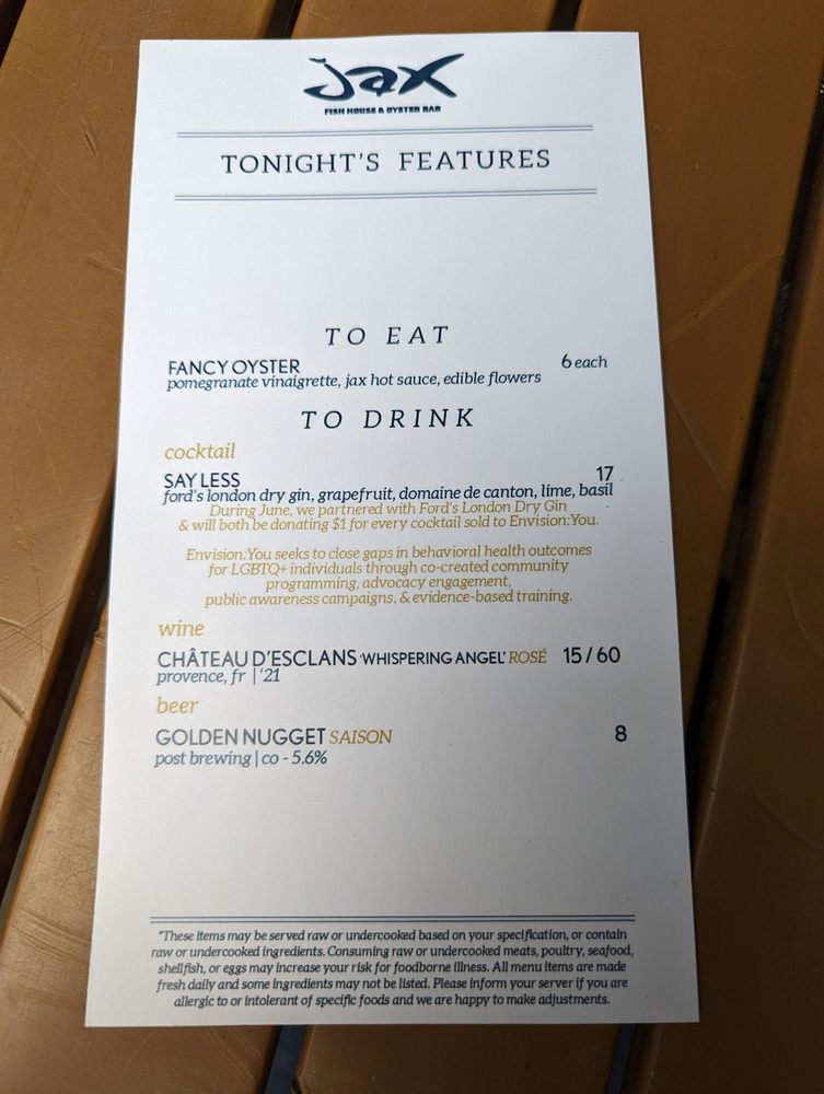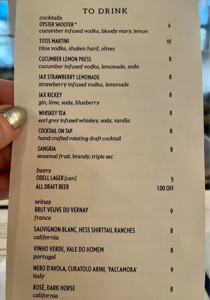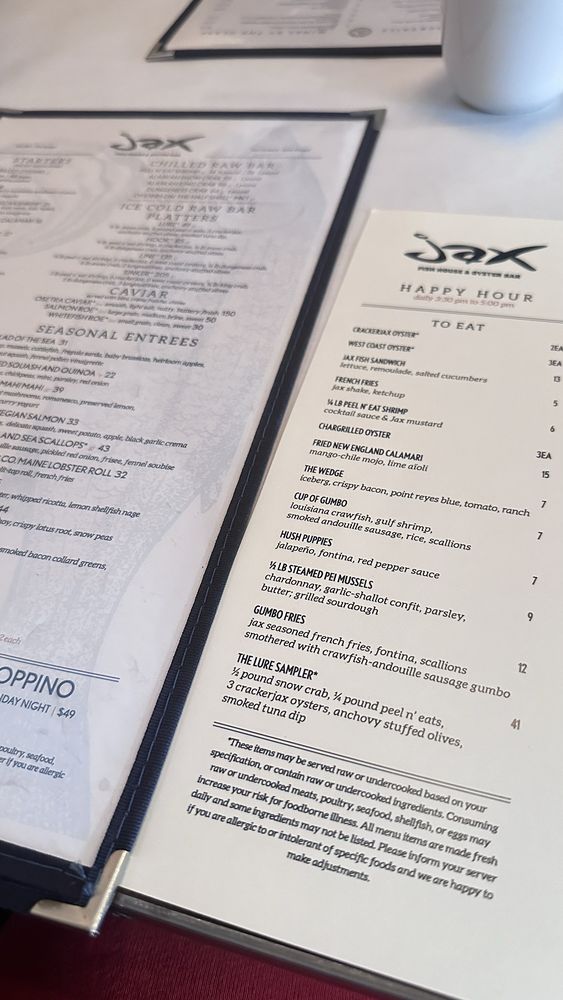 Introducing the menu at Jax Fish House LoDo, a New American seafood restaurant located in Denver, CO, offering a range of dining options. The happy hour menu features items like LB Peel n' Eat Shrimp, Steamed PEI Mussels, and Chile Lime Fish Tostadas. The main menu includes dishes like Ahi Tuna Poke, Baconfat Cornbread, and Acid Trip cocktails. With a focus on fresh seafood and a casual atmosphere, Jax Fish House LoDo caters to a variety of dietary preferences, including vegan options and limited vegetarian choices. The restaurant is also wheelchair accessible and offers outdoor seating options. Whether you're looking for a quick bite during happy hour or a leisurely dinner, Jax Fish House LoDo has something for everyone.